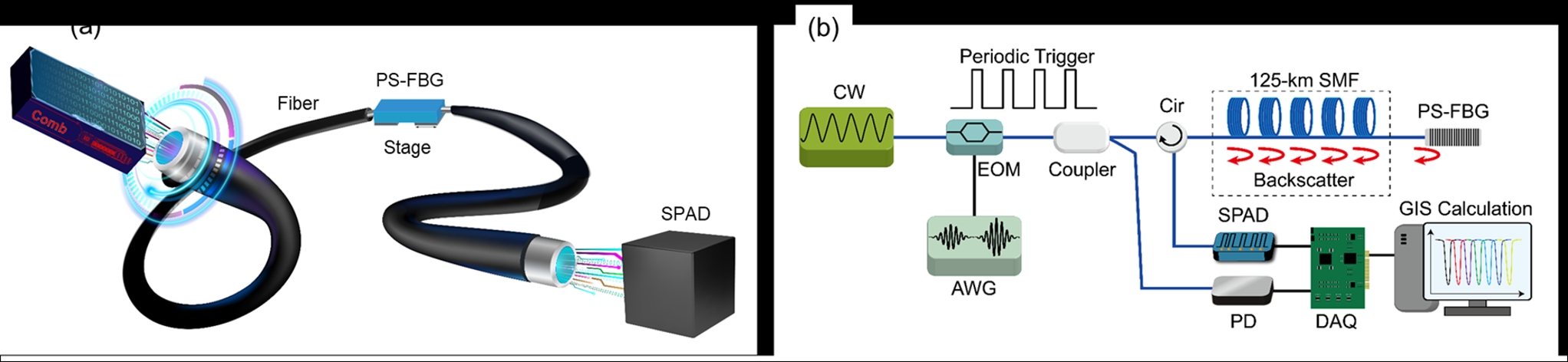 图a基于单光子双梳鬼成像光谱技术的长距离光纤传感示意图,图b实验配置示意图。
