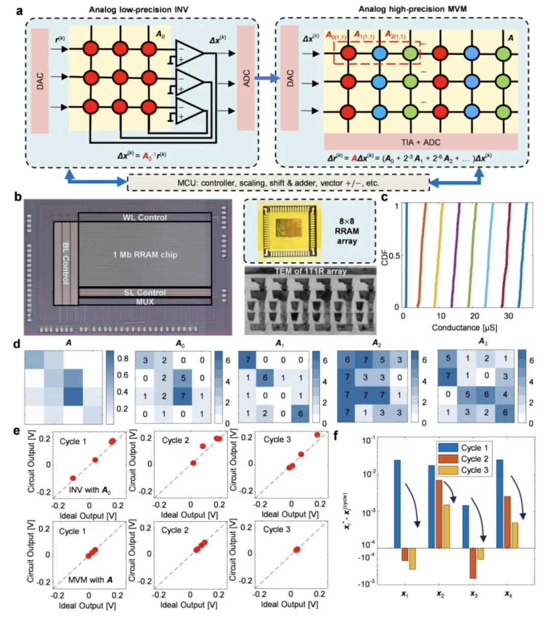 在计算精度方面,团队在实验上成功实现16×16矩阵的24比特定点数精度求逆,矩阵方程求解经过10次迭代后,相对误差可低至10⁻⁷量级。