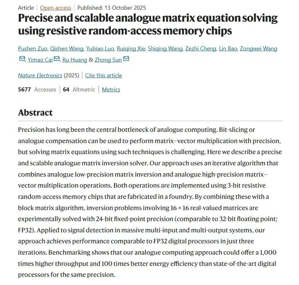 据北京大学消息,这一成果标志着我国突破模拟计算世纪难题,在后摩尔时代计算范式变革中取得重大突破,为应对人工智能与6G通信等领域的算力挑战开辟了全新路径。