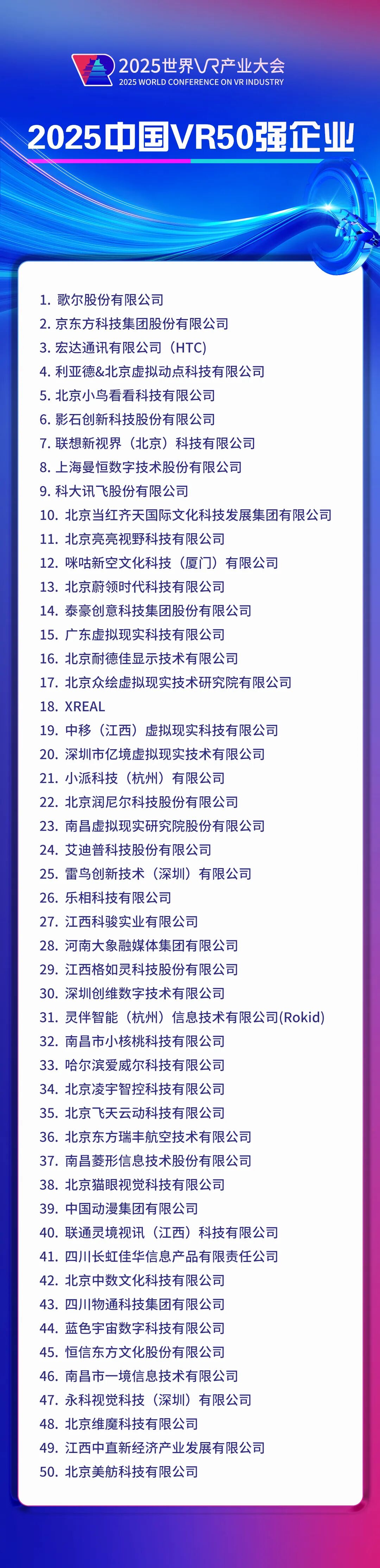 10月19日,“2025中国VR50强企业”名单正式发布,这是“中国VR50强企业”名单连续第七年发布。此次,歌尔股份有限公司、京东方科技集团股份有限公司等上榜。