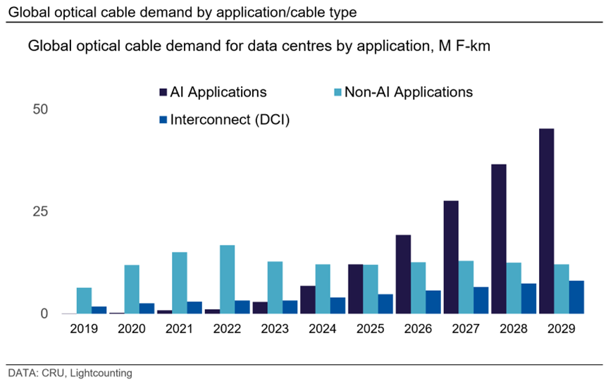 CRU将数据中心光缆需求分为三个主要类别——AI应用、非AI应用和数据中心互连(DCI)。2024年,AI应用的光缆需求实现了最高的同比增长率,达到138%。此外,在2025年,预计AI应用的光缆需求将继续以77%的同比增长率远超过非AI应用,并预计到2029年的五年复合年增长率(CAGR)为26%。