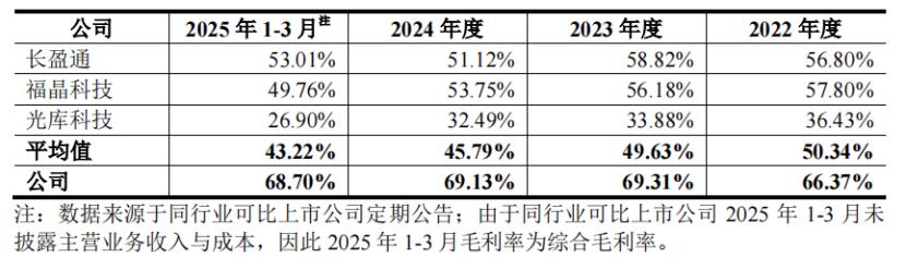 报告期内,长进光子的主营业务毛利率分别为66.37%、69.31%、69.13%、68.7%。