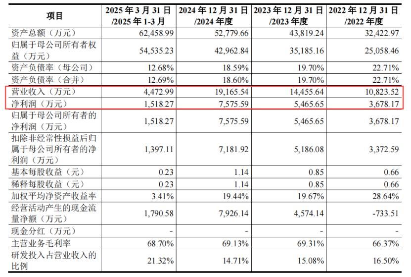 2022年、2023年、2024年和2025年1-3月(报告期),公司营业收入分别为1.08亿元、1.45亿元、1.92亿元、4472.99万元;净利润分别为3678.17万元、5465.65万元、7575.59万元、1518.27万元。