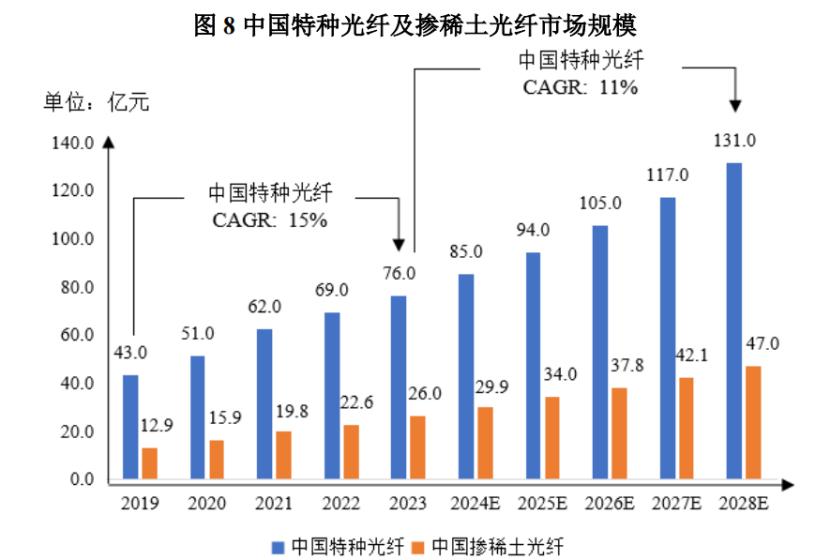 国内方面,特种光纤市场规模从2019年的43亿元增长至2023年的76亿元,2028年有望进一步攀升至131亿元。其中,掺稀土光纤2023年的市场规模为26亿元,2028年预计增长至47亿元。