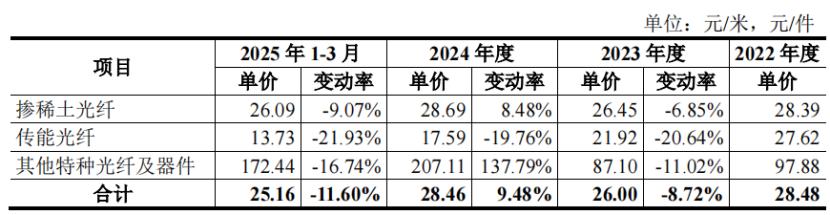 2025年1-3月,掺稀土光纤、传能光纤、其他特种光纤及器件的单价变动分别为-9.07%、-21.93%、16.74%。