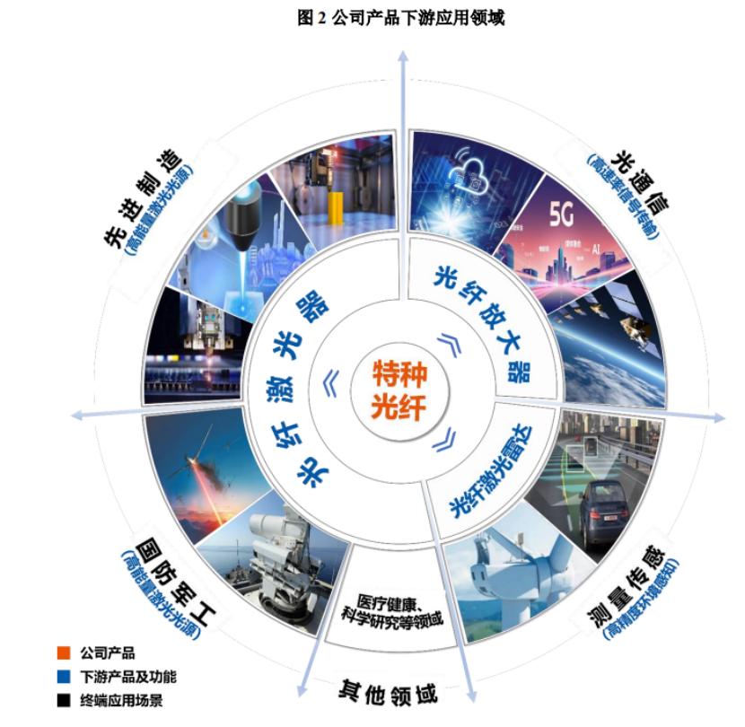 公司主要产品掺稀土光纤是特种光纤的重要子类,是激光产业链上游核心光学材料,是各类光纤激光器、光纤放大器、光纤激光雷达的核心元器件,广泛应用于先进制造、光通信、测量传感、国防军工、医疗健康、科学研究等领域。