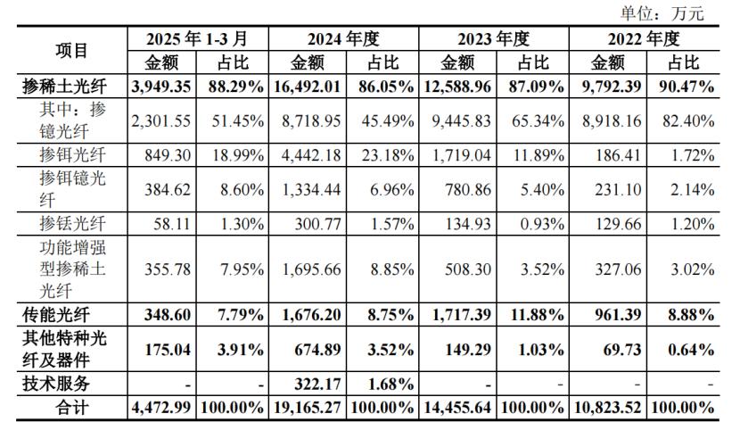 按产品线划分,掺稀土光纤为公司的核心产品,各期收入占比均超过85%,其中2024年,掺镱光纤、掺铒光纤的收入占比分别为45.49%、23.18%。