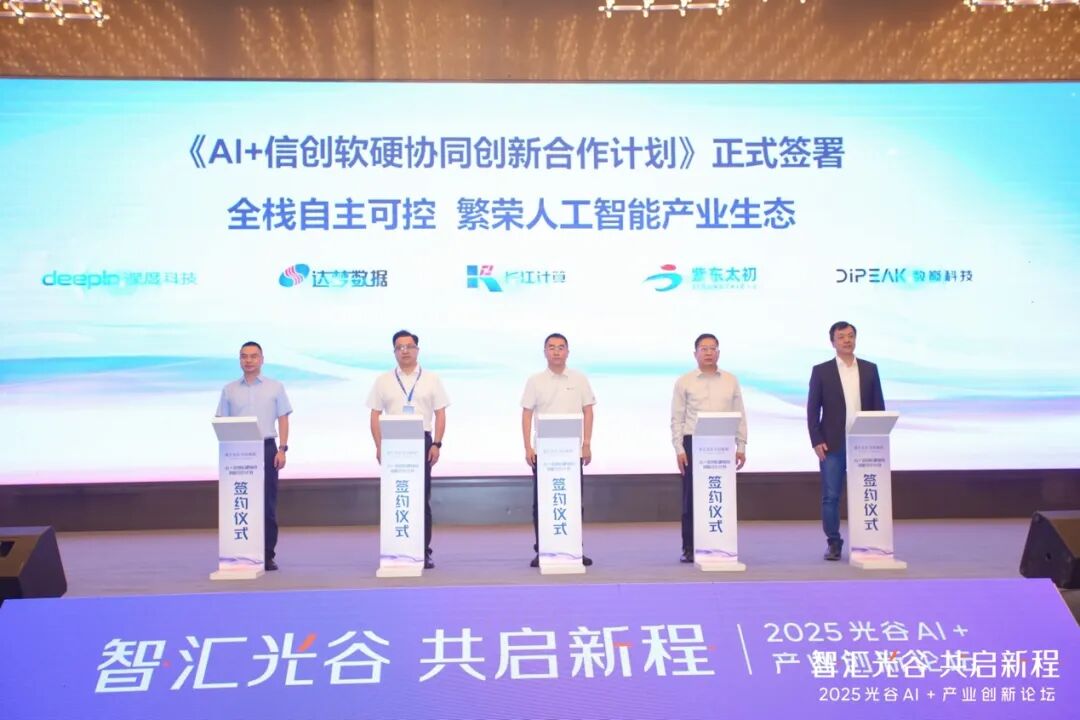 同时,长江计算、紫东太初、达梦数据、深度科技、数巅科技携手,正式启动了《AI+信创软硬协同创新合作计划》,旨在整合各方技术、资源与科研优势,联合开展AI+信创领域的技术研发与创新,通过优化资源配置、提升利用效率,共同构建国产自主可控的人工智能产业一体化生态,为光谷乃至全国AI+信创产业高质量发展注入协同新动能。