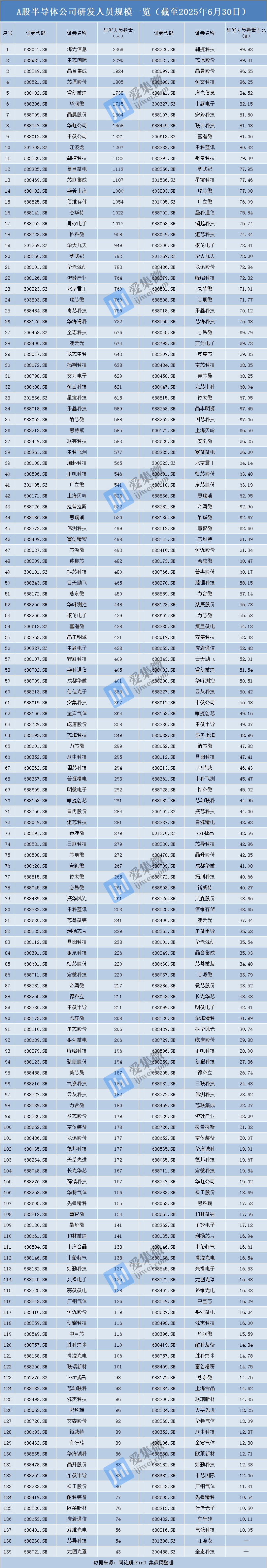 截至2025年6月30日,披露研发人员数据的139家企业中,海光信息研发人员数量最多,达2369人。紧随其后分别为中芯国际、晶合集成、芯原股份、睿创微纳、华润微、晶晨股份、华虹公司、中微公司、江波龙、翱捷科技、复旦微电、芯联集成、盛美上海、佰维存储、杰华特、甬矽电子,研发人员数量分别为2290人、1924人、1805人、1738人、1715人、1564人、1408人、1321人、1207人、1132人、1113人、1107人、1080人、1054人、1022人、1017人。