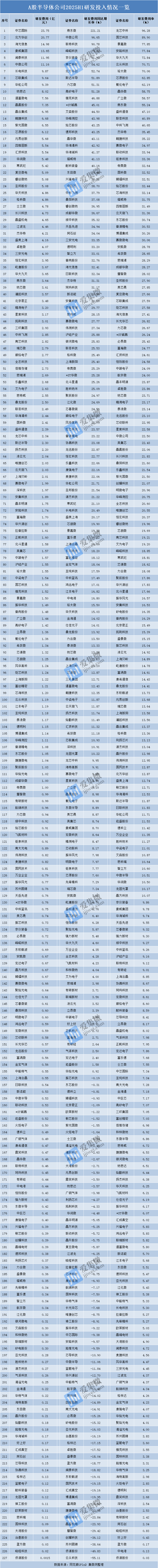 4.A股半导体公司上半年年研发投入排行榜:227家合计投入471亿元 整体研发费用率10.31%