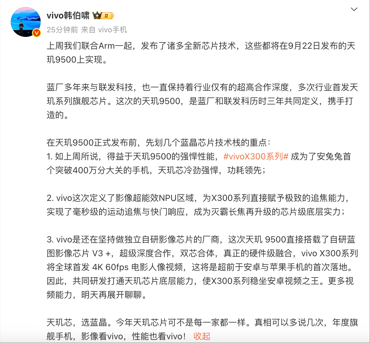 凤凰网科技讯 9月16日,vivo通信科技有限公司产品经理韩伯啸发文,与Arm联合发布的诸多全新芯片技术,将在9月22日发布的天玑9500上实现。韩伯啸称,得益于天玑9500的强悍性能,vivo X300系列成安兔兔首个突破400万分大关的手机。