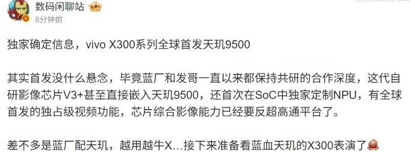 有数码博主表示,这代自研影像芯片V3+甚至直接嵌入天玑9500,还首次在 SoC中独家定制NPU,有全球首发的独占级视频功能,芯片综合影像能力已经要反超高通平台。