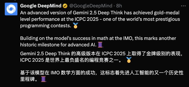 谷歌DeepMind的内部研究表明,Gemini 2.5 Deep Think高级版本也能在2023年和2024年ICPC世界总决赛中取得金牌级别的表现,表现不亚于全球前20名竞技开发者。