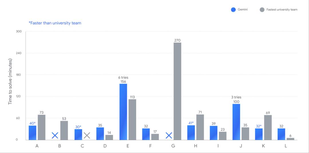 下图是2025年ICPC总决赛中解决每个问题所用的时间,Gemini所花的时间以蓝色显示,最快的大学生团队的时间以灰色显示。