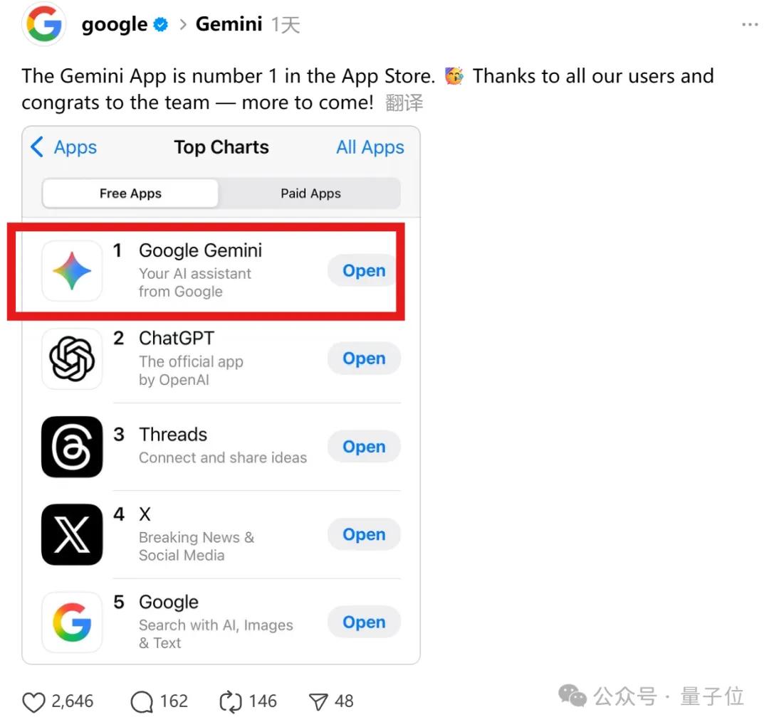 由于Nano Banana实在太好用,搭载它的Gemini也迅速走红,将ChatGPT从苹果应用商店应用下载量榜首拉下了马。