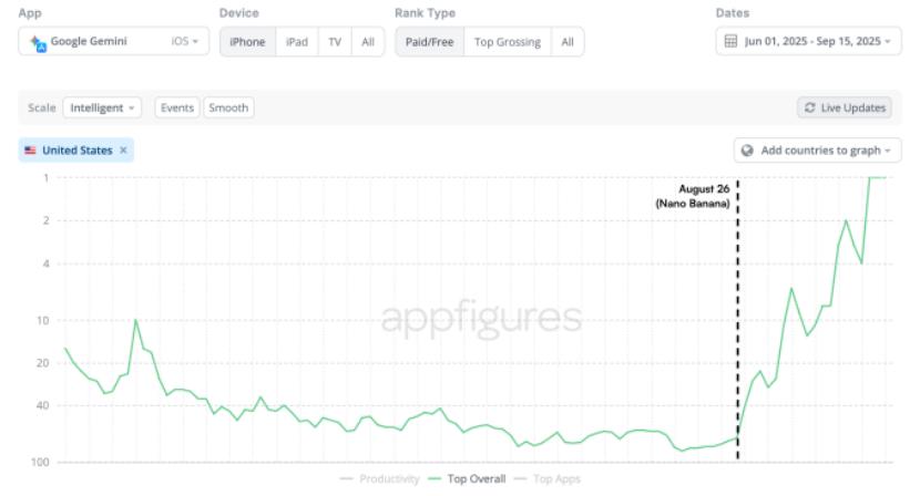 Nano Banana在8月26日“匿名”发布,后来证明这款模型就是谷歌的Gemini 2.5 Flash Image模型。Nano Banana的成功也使得谷歌的Gemini APP的下载量飙升。