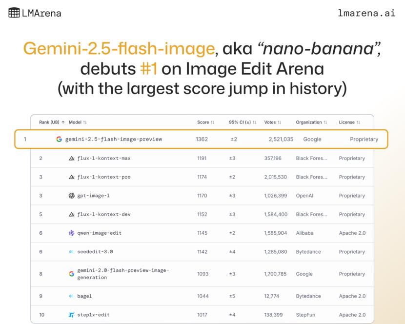 上线后Nano Banana的Elo分数明显领先(来源:LM Arena网站)