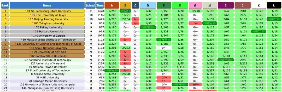 人类团队方面,俄罗斯圣彼得堡国立大学的参赛队伍排名第 1,解决了 11 个问题。北京交通大学、清华大学、北京大学、中国科学技术大学的参赛队伍分别排名 2、4、5、9。