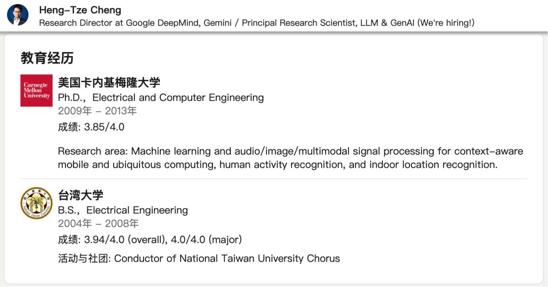Heng-Tze Cheng 是 Google DeepMind 的研究总监兼首席研究科学家,专注于大语言模型和对话 AI 的研究与应用。他在自然语言处理(NLP)、推荐系统、强化学习和多模态推理等领域具有深厚的研究背景。