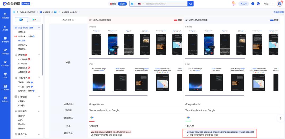移动端的数据方面,由于Nano Banana在两大平台的更新版本上线时间不一(Google Play更新于8月20日;App Store更新于9月3日)。故而数据爆发自9月8日《Google Gemini》围绕这一重要功能上线了主题为「Edit images with Nano Banana」的推广活动才初见端倪。