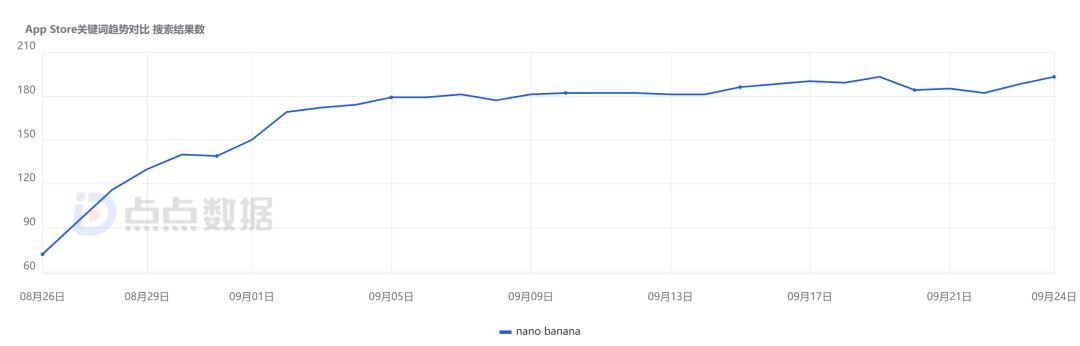 截止到9月13日免费榜登顶,《Google Gemini》的单日下载量突破302万,而这一数据在8月26日Nano Banana正式推出之日仅有49万。与此同时,这一功能的火热程度还直观体现在了其关键词热度上。根据点点数据统计的“Nano Banana”这一关键词的ASO数据,其流行度、搜索结果数都于九月初暴增。仅9月3日功能上线一周,以该关键词命名的App数量便有172个。