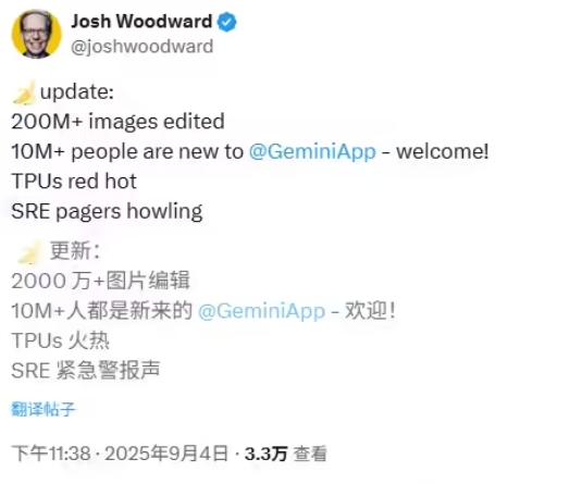 这一功能一经上线便迅速引发全球用户的热情,根据谷歌实验室副总裁Josh Woodward 9月4日透露的数据,Nano Banana功能上线一周的时间内,已累计完成超2亿次图像编辑,带动超1000万新用户尝试Gemini应用。内部系统一度“TPU严重过载,SRE警报不停”。