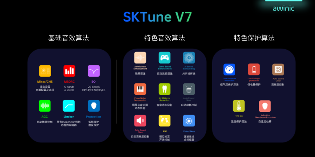 音效算法:艾为国民神仙算法awinicSKTune®V7,含基础音效及保护算法,特色音效算法、特色保护算法。