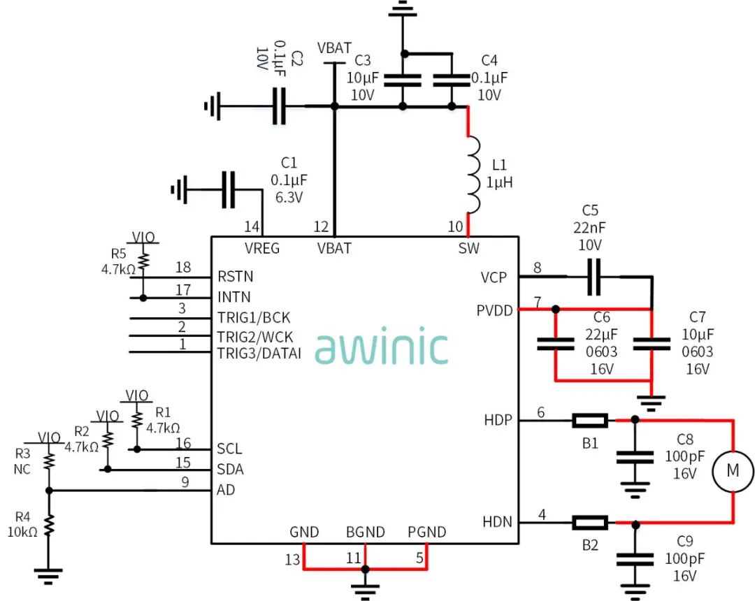 在操作设计方面,采用了一体式手柄设计,配备触控板、双震动马达、RGB霍尔摇杆以及键程可调的扳机键。其中,双震动马达驱动采用了艾为高压Haptic驱动方案,可调键程采用了艾为线性HALL方案,以下是两款芯片的介绍: