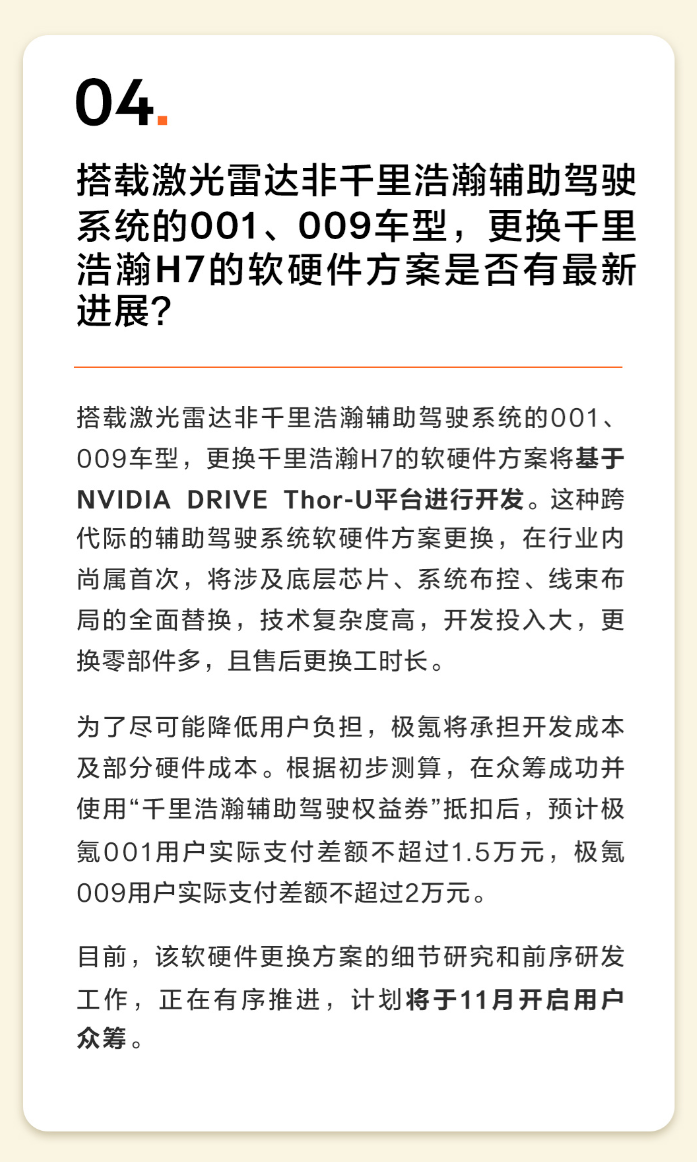 为了尽可能降低用户负担,极氪称将承担开发成本及部分硬件成本。根据初步测算,在众筹成功并使用“千里浩瀚辅助驾驶权益券”抵扣后,预计极氪 001 用户实际支付差额不超过 1.5 万元,极氪 009 用户实际支付差额不超过 2 万元。