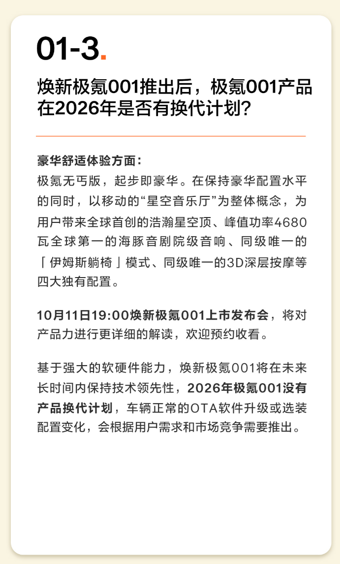 IT之家 10 月 10 日消息,焕新极氪 001 将于 10 月 11 日 19:00 发布,官方今日发布答网友问(第 2 期)。