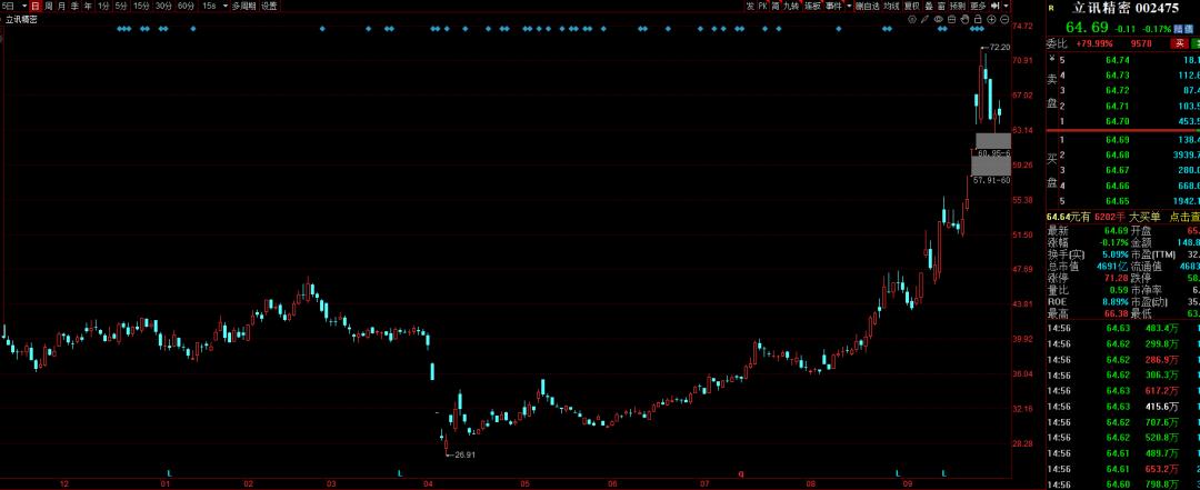 受此消息刺激,立讯精密股价在此后的两个交易日连续冲击涨停。9月24日,立讯精密股价报收于70.2元,市值突破5000亿元大关,创下历史新高。从2024年9月来看,立讯精密股价月度涨幅超过40%,总市值一个月内增长超过1300亿元。近日虽有回落,但市值依然高达 4427.34 亿人民币。