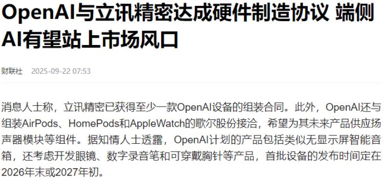 美国当地时间9月19日,据外媒The Information(信息报)报道,OpenAI已经与立讯精密签署协议,将共同打造一款消费级设备,这将是OpenAI第一次AI硬件尝试,而立讯精密则会成为这款设备的第一个中国合作商。根据协议,立讯精密将负责至少一款消费级设备的组装工作,该设备目前处于原型开发阶段,预计能与OpenAI的人工智能模型深度协作。合作产品可能包括智能音箱、眼镜、可穿戴设备等,首批预计于2026年末至2027年初发布。