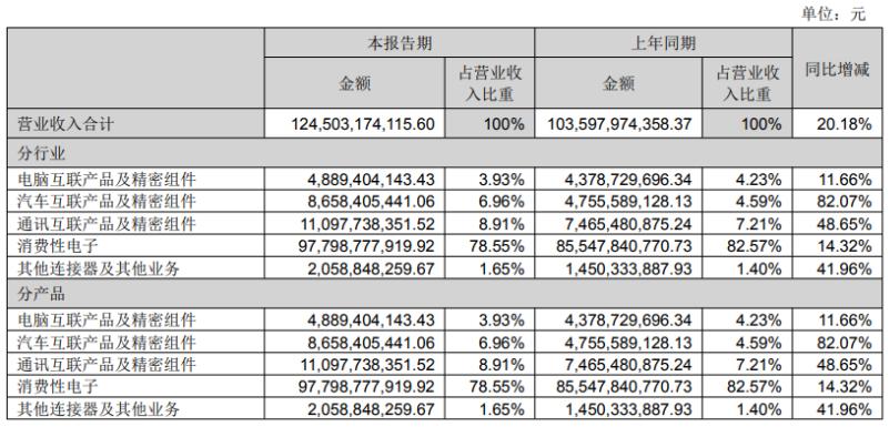 事实证明,立讯精密对于关税因素并不会从根本上影响消费电子竞争格局的这一判断非常到位。根据公司半年报数据,2025年上半年,立讯精密实现营收1245.03亿元,同比增长20.18%;实现归母净利润66.44亿元,同比增长23.13%。分业务来看,公司消费电子业务实现营收977.99亿元,同比增长14.32%,收入占比为78.55%;汽车业务实现营收86.58亿元,同比增长82.07%,收入占比为6.96%;通信数据中心板块实现营收110.98亿元,同比增长48.65%,收入占比为8.91%。