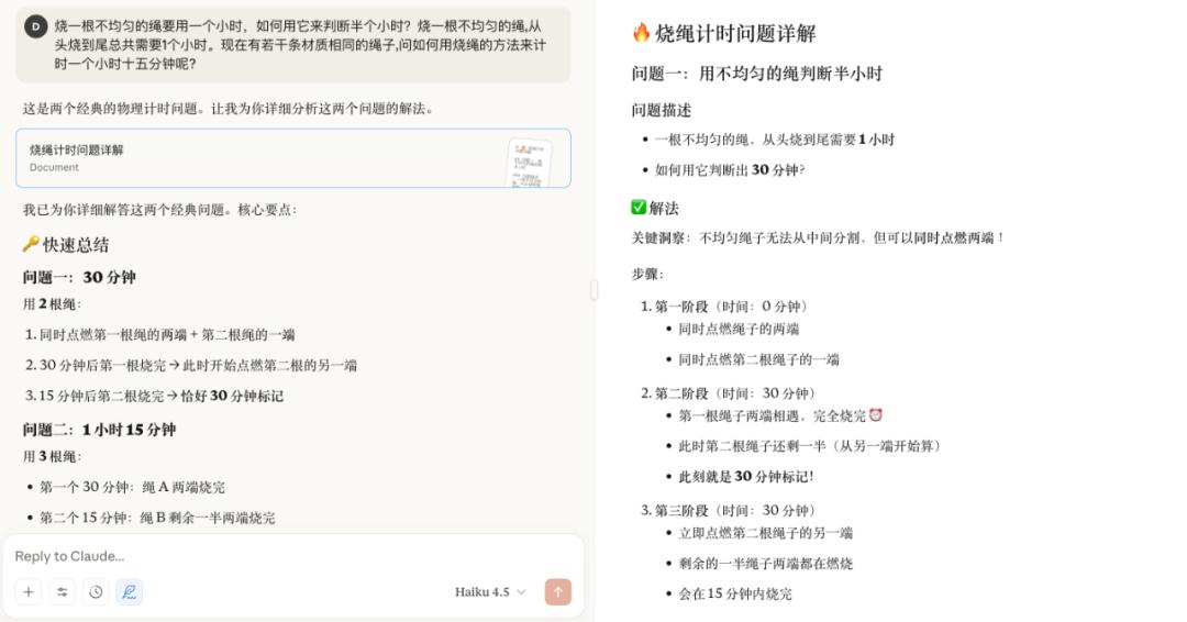 在下文这个经典的推理计算题, Claude 4.5 Haiku 响应速度优势就更明显了,当然,这也正是轻量级模型在实际应用中的核心竞争力所在。