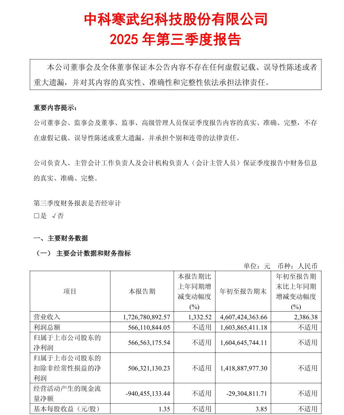 1.寒武纪前三季度营业收入46.07亿元,同比增长2386.38%