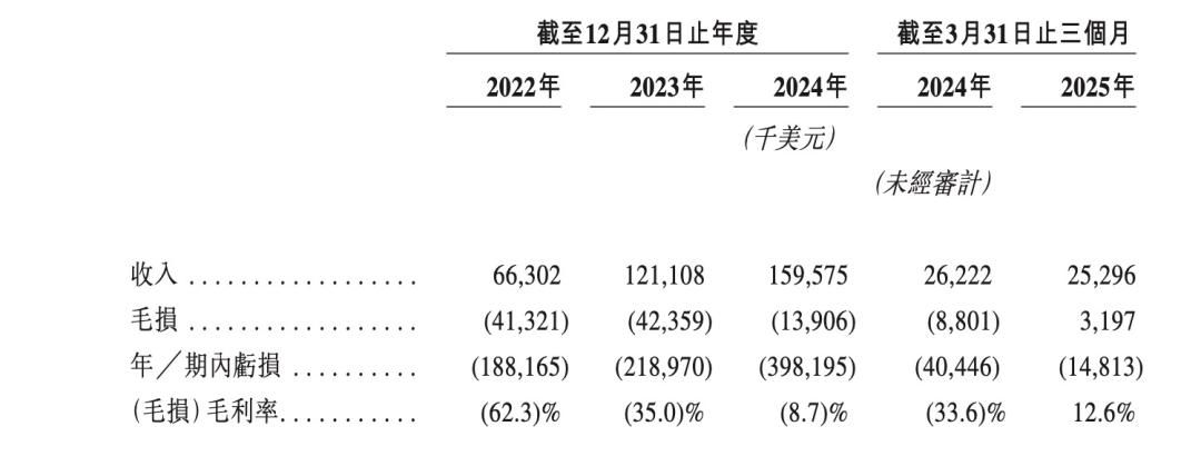 高成本烧钱投入,同时没有足够多的订单换回现金流,账面上,图达通仍然处于亏损状态。2022年到2024年,再加上2025年一季度,公司累计亏损超8亿美元,且从2022年至2024年公司亏损规模不断扩大,分别为1.88亿美元、2.19亿美元、3.98亿美元。