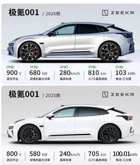 比如后驱版续航从675公里提升到710km,不过电池包容量没有变。根本原因是26款极氪001,终于用上了800V高压平台(官方口径900V),提高了整车的能量效率。