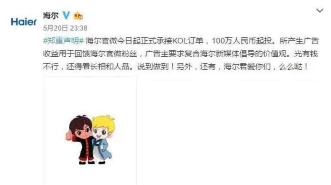 在海尔,沈方俊誉为海尔八十万蓝V总教头,团队运营的官方账号、渠道达近100个之多,其中海尔官微一改当时所有品牌官微冷冰冰的画风,开创了别具一格有温度的沟通方式,是人格化运营最早期的官微。