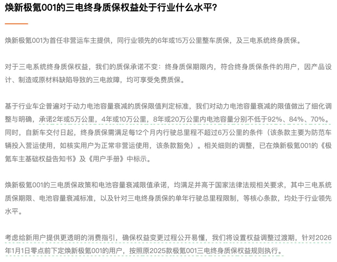 尤其是针对部分正在犹豫中的用户,想要更多免费流量时长和三电质保权益,极氪第一时间回复网友,在过渡期内仍为焕新001用户提供终身三电质保及流量权益,赢得了大量点赞。