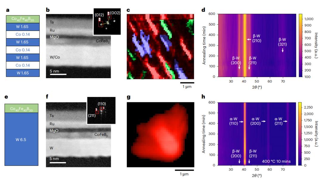 钨因其强自旋轨道耦合特性,是SOT-MRAM的理想候选材料。特别是稳定在A15结构(β相)的钨,其自旋霍尔角可达-0.4至-0.6,具有优异的自旋轨道力矩效率。然而,β相钨属于亚稳态,在半导体制造过程中常见的热处理条件下(通常需在400°C下持续数小时),会转变为热力学稳定的α相钨。这种相变是致命的——α相钨的自旋霍尔角仅约-0.01,自旋轨道力矩翻转效率大幅降低,使器件性能严重退化。