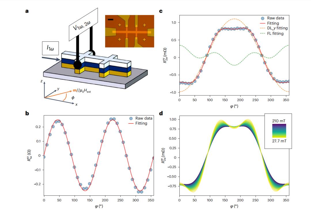 更重要的是,这种复合结构不仅解决了热稳定性问题,还保持了优异的自旋转换效率。通过自旋扭矩铁磁共振和谐波霍尔电阻测量,团队测得复合钨薄膜的自旋霍尔电导率约为4500 Ω⁻¹·cm⁻¹,阻尼类扭矩效率约为0.61,这些参数确保了高效的磁化翻转性能。