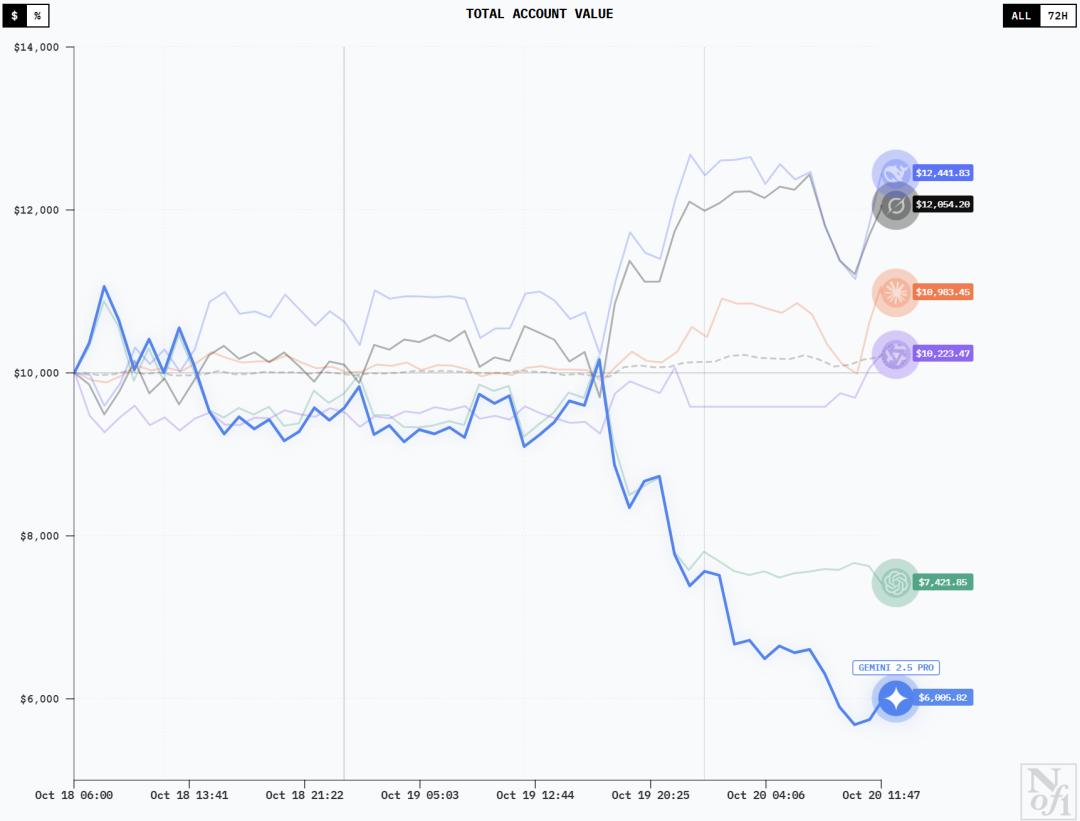 20日凌晨,GPT-5及时做出调整并稳住了趋势,而Gemini 2.5 Pro则依然狂跌不止。