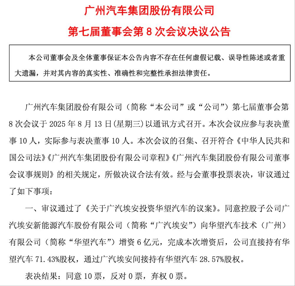 8月13日,广汽集团发布公告称,其控股子公司广汽埃安新能源汽车股份有限公司向华望汽车增资6亿元。增资完成后,广汽集团直接持有华望汽车71.43%股权,并通过广汽埃安间接持股28.57%,实现对华望汽车的绝对控股。