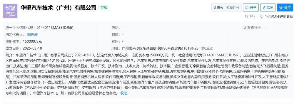 在“启境汽车”这个名称宣布前,广汽集团于2025年3月18日成立了华望汽车,由广汽集团投资15亿元。