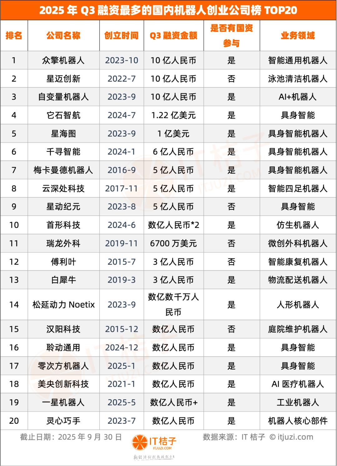 根据IT桔子统计,2025年Q3有三家机器人各自获得了约10亿元融资,分别是众擎机器人、星迈创新、自变量机器人。另外,它石智航、星海图均宣布了1亿美元以上的融资。