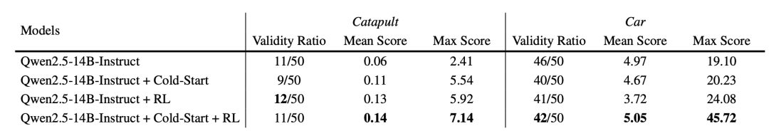 定量数据也显示,在“Cold-Start + RL”(用少量好例子启动+强化学习)的策略下,模型在小车任务上的最高分达到了45.72,投石机任务的平均分和最高分也都是最优的。