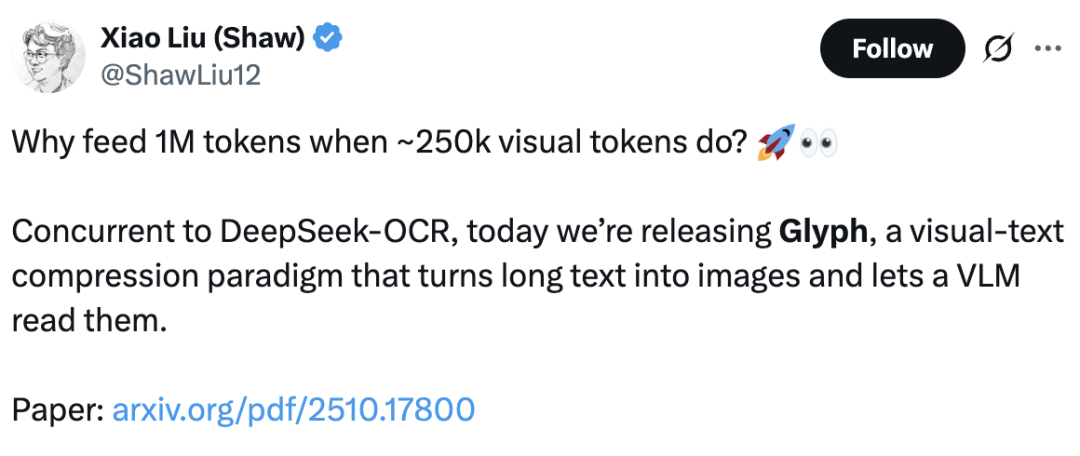 太卷了,DeepSeek-OCR刚发布不到一天,智谱就开源了自家的视觉Token方案——Glyph。