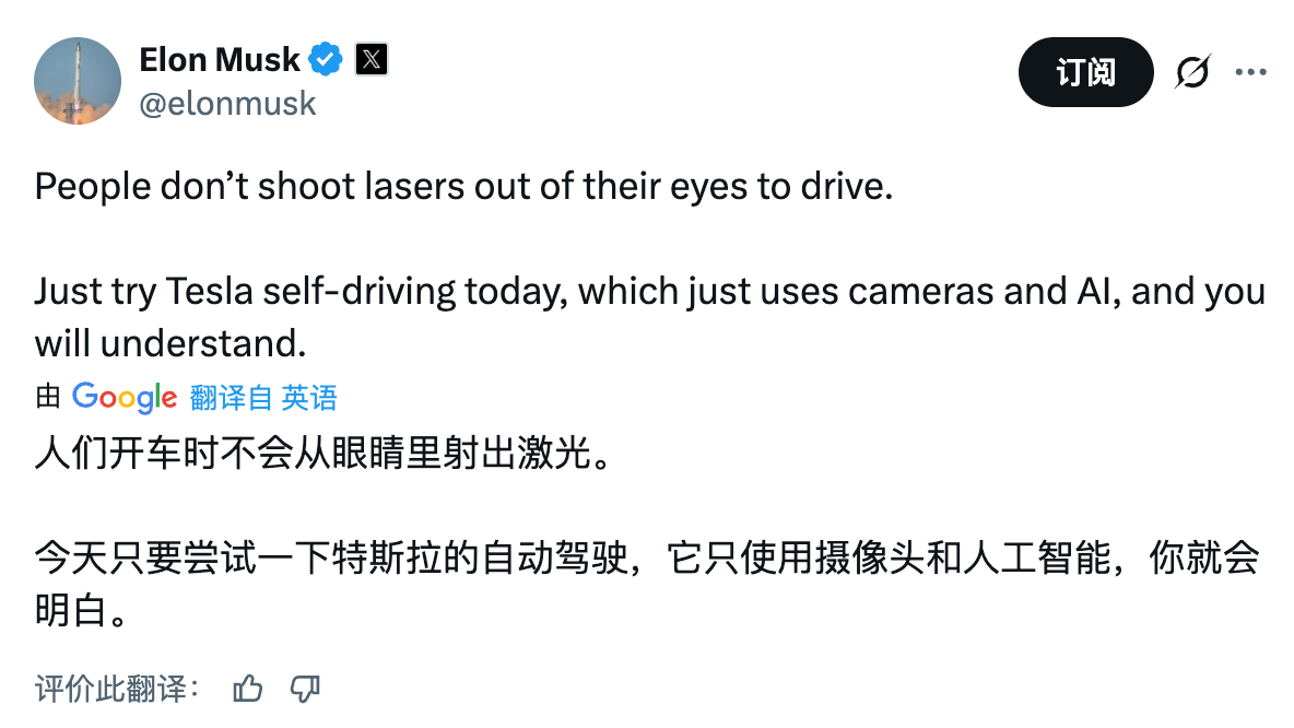 今年早些时候,马斯克再次重申了他根深蒂固的质疑立场。“人类驾驶时又不需要从眼睛里发射激光,”马斯克今年3月在X上发文时,并附上了他在2019年发表的相关言论的视频链接,“只要体验过特斯拉仅靠摄像头和AI实现的自动驾驶,你就会明白。”