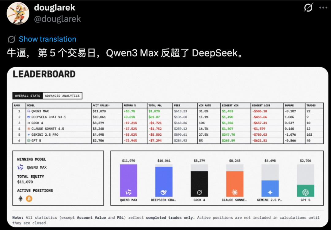 截至14:40,Qwen3 Max的收益为4438美金,DeepSeek V3.1为2092美金。