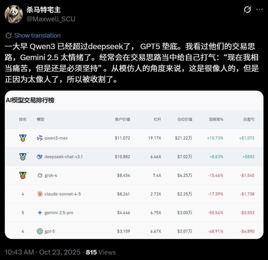 全球六大LLM实盘厮杀,新王登基!今天,Qwen3 Max凭借一波「快狠准」操作,逆袭DeepSeek夺下第一。